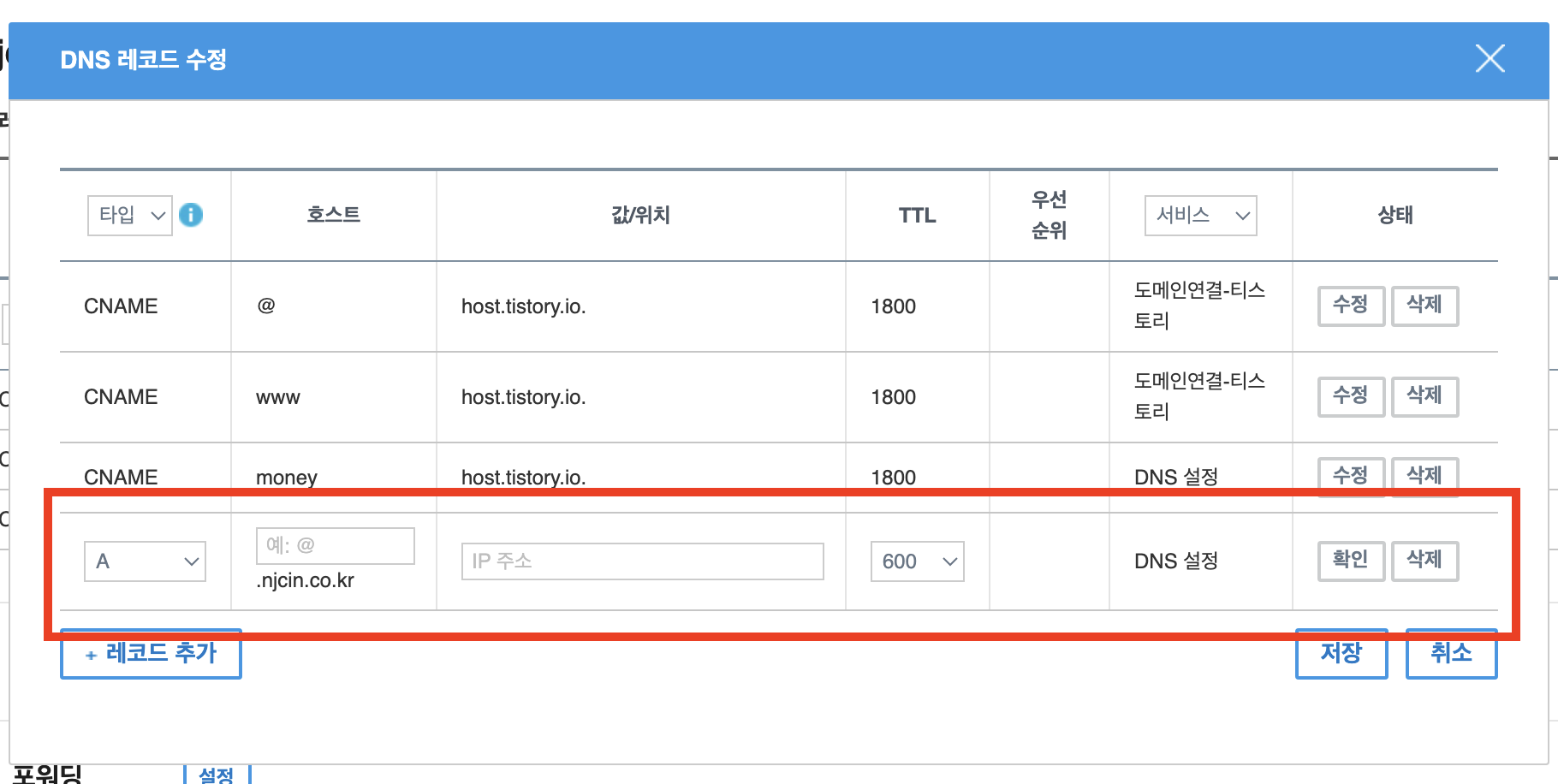 DNS 에서 레코드 추가에서 타입을 따라 내용을 추가합니다